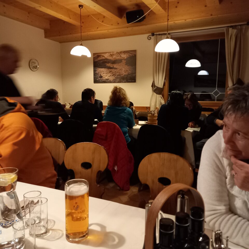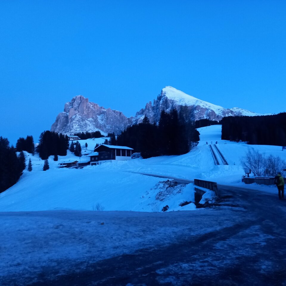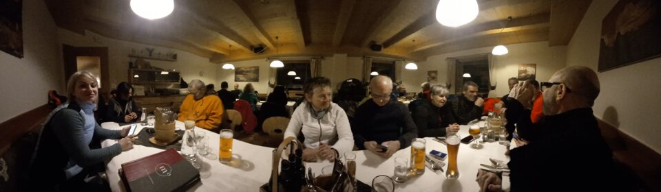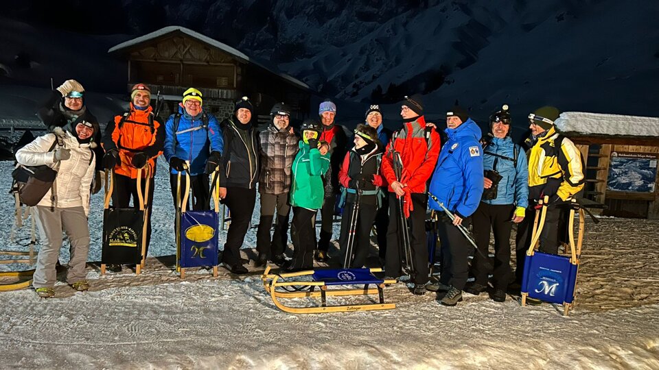 ......e si riparte......su due ruote non ancora ma con un bel gatto delle nevi, per chi lo ha scelto per salire al rifugio, o a piedi per i più "temerari" ma senza esagerare. Da Saltria si inizia a salire verso il Molignon con il sole che rischiara ancora il Sasso Lungo ed il Sasso Piatto e che fanno da cornice assieme al Seceda ed altre cime nei dintorni. Più si sale e più il giorno lascia spazio all'oscurità che però viene rischiarita con l'ausilio delle torce. Un'oretta di camminata e poi il rifugio è lì ad attenderci; si arriva in ordine sparso o sperso dato che alcuni al bivio hanno girato a sinistra anziché a destra......forse tanta voglia di allungare il giro per arrivare a destinazione belli affamati!!!! Chi poi è salito col gatto ne ha approfittato per iniziare con birretta e affettati misti, giusto per stuzzicarsi l'appetito. Arrivati anche gli ultimi (anche loro col gatto?? ma come, non erano a piedi??) come da orario ci si mette tutti a tavola nella saletta appositamente riservata per il nostro gruppo per dare inizio alle "danze" di forchette e coltelli. Ottima anche la cucina sia nel salato sia nei dolci che hanno concluso il recupero dell energie perse nella salita. Ora la parte più bella, la discesa in slitta!!!! Stirnlampe accese e ben indossate e poi viaaaaaaaa!!!!! La strada fatta in salita ora è più piacevole anche perché la luna piena si fa notare in cielo ed illumina l'ambiente intorno, la neve fa da amplificatore. Arrivati al Tirlerhof si lasciano le slitte e si fa ritorno alle auto. Saluti di rito, con conta delle persone per evitare dispersi, e poi tutti a casa pronti per la prossima avventura......anzi, luna piena!!!!